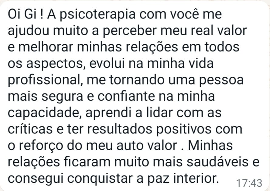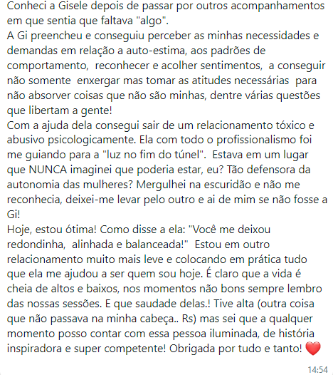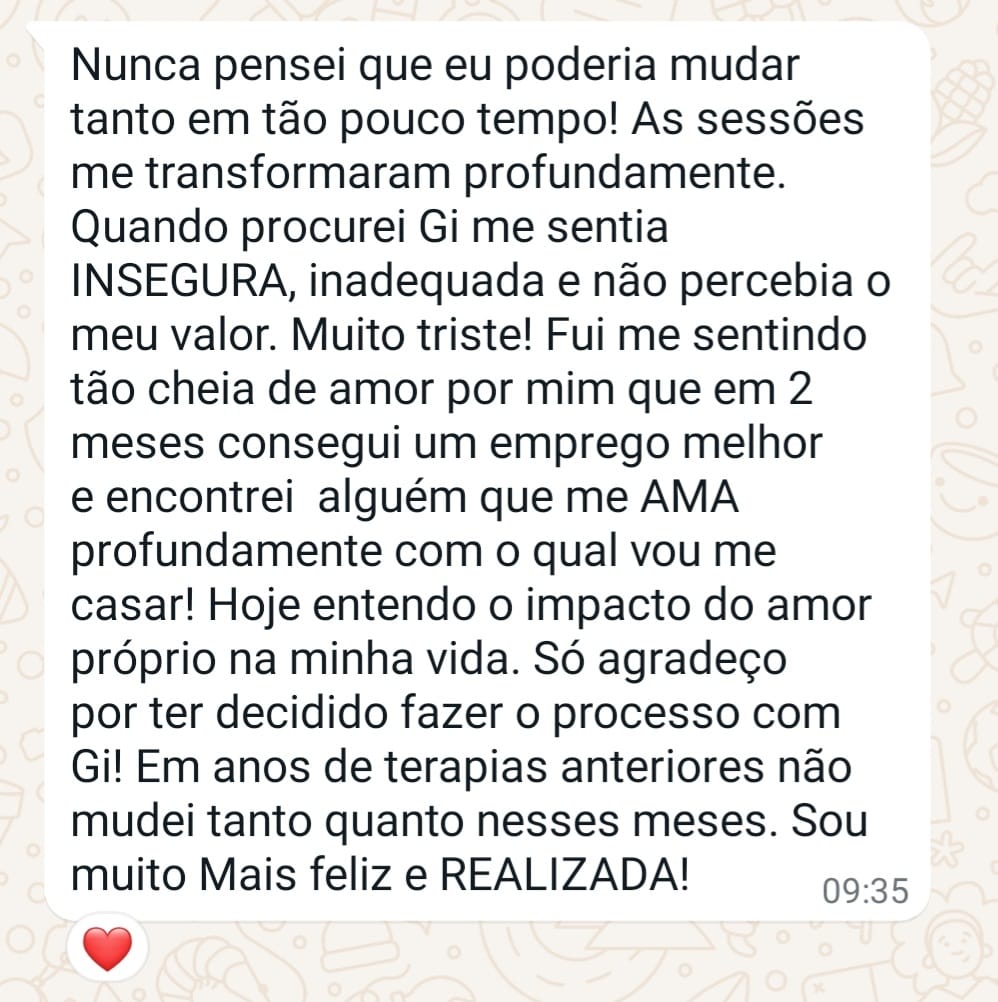Numerosos depoimentos de clientes atestam ter aumentado a autoestima e a percepção de AUTOVALOR, o que as levou a experimentar TRANSFORMAÇÕES SIGNIFICATIVAS em suas vidas por meio deste processo psicoterapêutico, mais especificamente, HARMONIZANDO suas relações consigo mesmas, aprendendo a ESTABELECER LIMITES aos outros, reconhecendo e atraindo mais AMOROSIDADE para suas vidas e ENCERRANDO conflitos repetitivos em seus RELACIONAMENTOS.