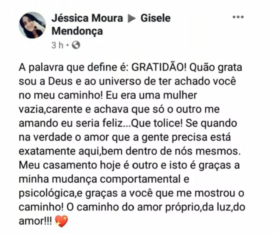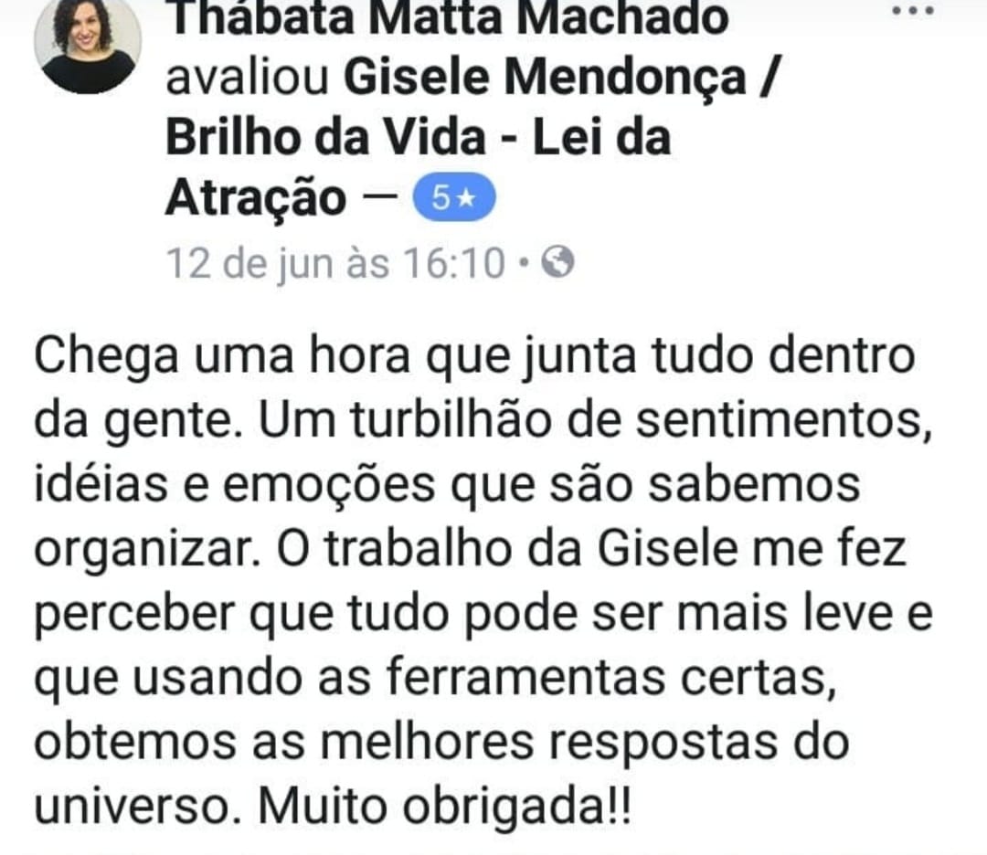 Gisele Mendonça, uma Psicóloga especializada na Abordagem Integrativa Transpessoal (AIT), que integra o SER em suas quatro funções psicológicas: Razão, Emoção, Sensação e Intuição, gerando o aprofundamento e grande clareza nos conflitos vivenciados e buscando a expansão da consciência por meio de técnicas de respiração, visualizações criativas, escrita intuitiva, arteterapia, grafismos que contribuem para resultados mais rápidos e eficazes.